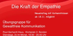 - Die Kraft der Empathie – Übungsgruppe für Gewaltfreie KommunikationNeueinstieg mit Vorkenntnissen ab 18.11. möglich!Paul-Gerhardt-Haus, Kirchplatz 2, SendenDienstags, 2x im Monat, 19.00 – 20.45 UhrInformationen bei Gerald Bohe (Pfarrer)Gerald.Bohe@elkb.de…